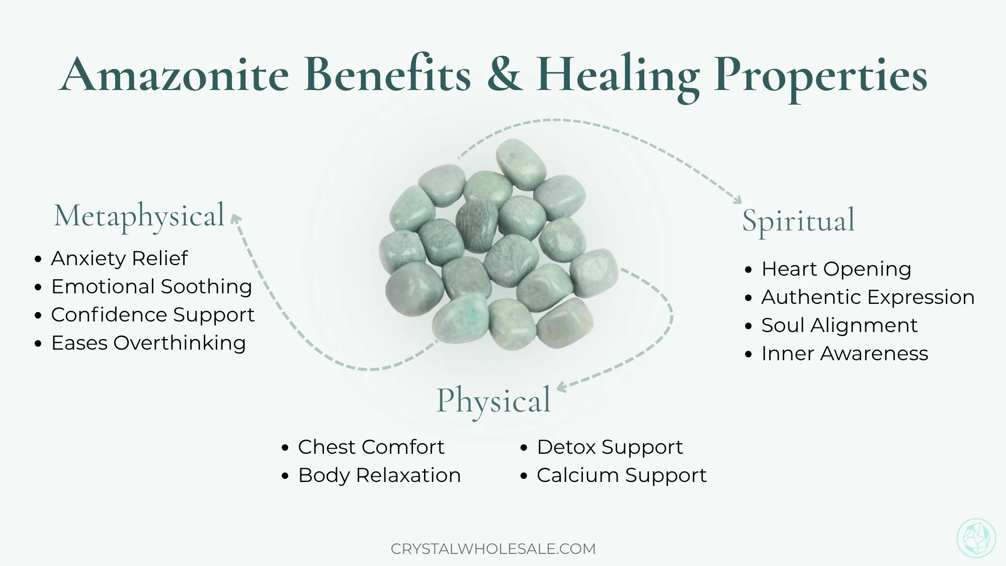 Amazonite supports relaxation, detoxification, energetic protection, and physical comfort. Its energy helps release stress held in the chest, throat, shoulders, and nervous system, making it especially helpful for tension, fatigue, heaviness, and sensory overload caused by long periods of work or emotional strain.