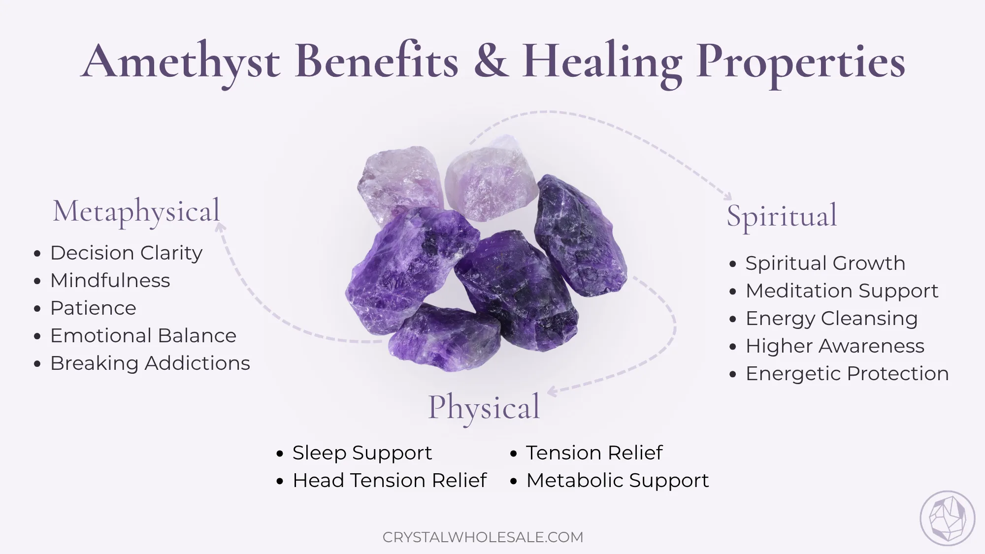 In crystal healing traditions, amethyst is valued for promoting calm, clear thinking, and emotional balance. It is also commonly associated with stress relief and better sleep.